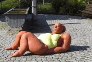 Die vierbrüstige Flussgöttin sonnt sich, Glasfaserbeton bemalt, 2000, L= 250 cm, öffentlich: Skulpturenweg Pfinztal